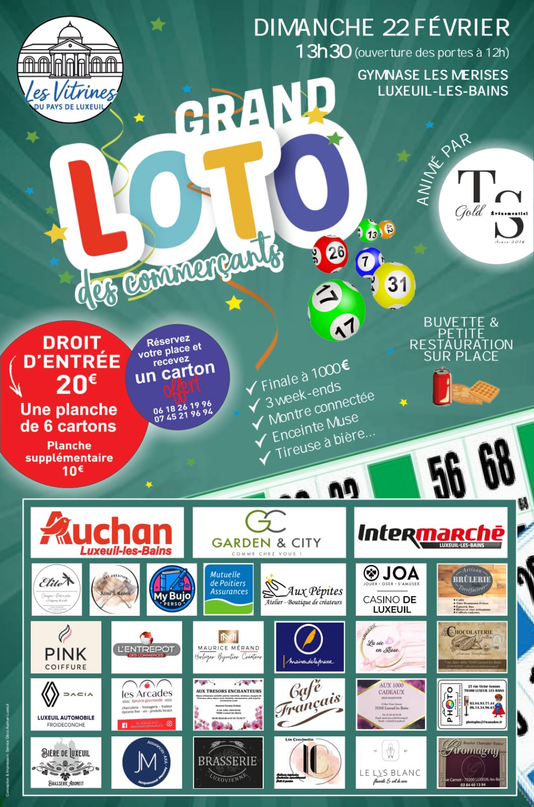 L'association des commarçants, Les Vitrines du Pays de Luxeuil, organise un grand loto dimanche 22 février à 13h30 au gymnase des Merises. Réservez votre place et recevez un carton offert : 06 18 26 19 96 ou 07 45 21 96 94. Plus d'infos, cliquez ici